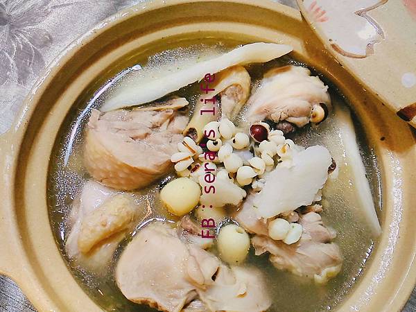 今天雖是冬至,氣溫高達28度,適合來點溫和的湯品。四神湯常使用的豬腸、豬肚,小朋友接受度不高,改為雞肉。大人食用,可先將當歸泡在米酒中一天,食用時滴入香味四溢。